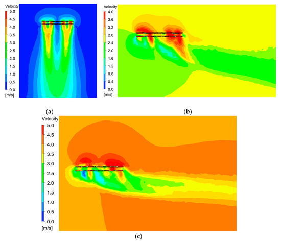 In Figure 9, it can be clearly noted that the downwash flow is moved along with the wind direction. Compared with the case with no wind effect, the velocity variation becomes even more complex, which will affect the aerodynamic performance of the coaxial Tri-rotor. Moreover, with the increase of the horizontal wind velocity, the downwash velocity of the coaxial Tri-rotor gradually decreases and the velocity gradient arrangement of downwash becomes closer, leading to the strong rotor interference. It can be seen that the aerodynamic coupling will be affected by the external airflow and aggravate the aerodynamic interference between the rotors. Moreover, the enhancement of aerodynamic interference will bring the increase of required power. This also verifies that in Figure 5 and Figure 7, the overall power consumption of the coaxial Tri-rotor system with the influence of external airflow is significantly greater than that without airflow.