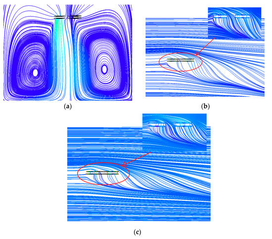 The streamline distribution of the coaxial Tri-rotor (2200 r/min): (a) 0 m/s; (b) 2.5 m/s; (c) 4 m/s.