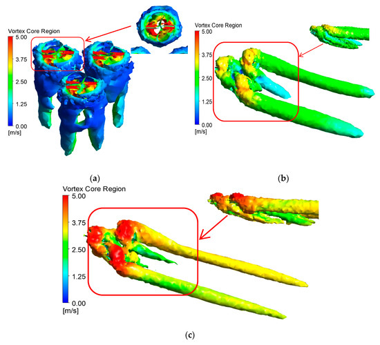The vortex distribution of the coaxial Tri-rotor (2200 r/min): (a) 0 m/s; (b) 2.5 m/s; (c) 4 m/s.