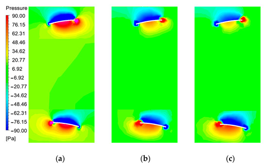 The vertical pressure contour of rotor tip in a coaxial rotors unit (2200 r/min): (a) 0 m/s; (b) 2.5 m/s; (c) 4 m/s.