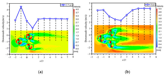 The velocity variation of the lower rotor plane: (a) 2.5 m/s; (b) 4 m/s.