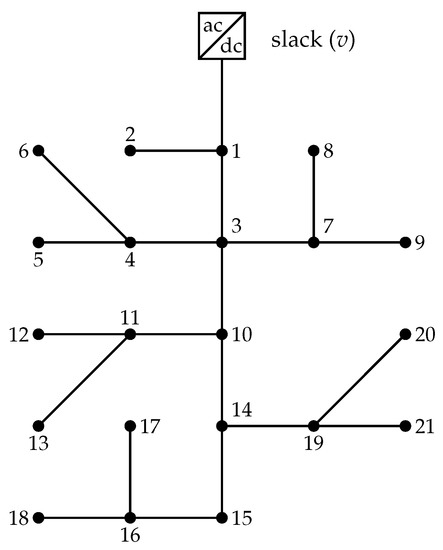 The 21-node test feeder is a DC distribution network that is composed of 21 nodes and 20 branches that generates a radial configuration where the voltage-controlled source is connected at node 1. This source supports a voltage profile of pu [19]. The complete information regarding constant power consumption and branches are presented in Figure 1 and Table 1, respectively [19].