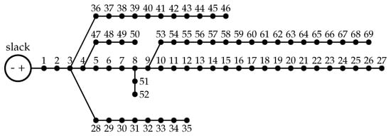In this section, the main characteristics of the 21- and 69-node test feeders are presented. These grids are mainly used in power system analysis for DC networks, including voltage stability, power flow analysis, and distributed generators’ optimal location [37]. Both of the test feeders are described below.