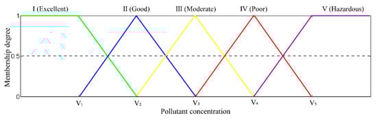 Membership degree is the basic idea of fuzzy math and is objectively existent. It can be denoted by , which means the membership degree of factor aiming at the comment . Membership degree is an effective solution to the problem of data near boundary (for the first limitation of the AQI). For air quality evaluation, a pollutant concentration value can belong to both possible levels to various extents rather than be defined as only one certain level, and further membership degree will be combined with factor weight to make a comprehensive evaluation. The membership function can calculate the membership degree of pollutant concentration to the evaluation level. Commonly employed membership functions include the rectangular distribution function, Cauchy distribution function, Gauss distribution function, ridge distribution function, K-order parabolic distribution function, etc. In view of this evaluation object, factor and criterion, the trapezoid-triangle distribution function is adopted in this study. Details are presented as Equations (4)–(6) and Figure 1.