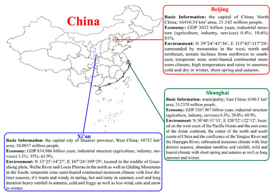 To prove the feasibility of the AQFCE in practice, it has been fully tested under various conditions in China. According to “Three-year Action Plan for Winning the Blue Sky Defense War” issued by the China’s State Council in June 2018, the Fenwei Plain has replaced Pearl River Delta to be the key area of air pollution control together with the Jing-jin-ji region and Yangtze River Delta. As representative cities, Beijing, Shanghai and Xi’an (Figure 2), with different environments, industrial structures and pollution features, are selected. Unreasonable industrial and energy structures as well as continuously rapid growth of vehicles have caused huge emissions of local pollution, which is common in the three metropolises. In addition, Beijing and Xi’an are, respectively, located in the northeast and southwest of “Jing-jin-ji air pollution transmission channel”, so they are often affected by regional pollution transport. Adjacent to sand sources, they also suffer from sand- and dust-storms in spring. Daily and hourly concentration data of six conventional air pollutants from September 2018 to August 2019 are from the Ministry of Ecology and Environment of China (http://www.mee.gov.cn). In view of the excessive hourly data, the representative month of every season (October, January, April and July) are used in hourly evaluations. The AQI is the most widely used and recognized air quality evaluation method at present, so comparative analysis with the AQI in practice is necessary for any new method. Therefore, based on the same monitor data, comparative analysis between the AQI and AQFCE is carried out on different spaces (Beijing, Shanghai, Xi’an), time (spring, summer, autumn, winter), tasks (daily report, hourly report) and purposes (air quality level, chief pollutant).