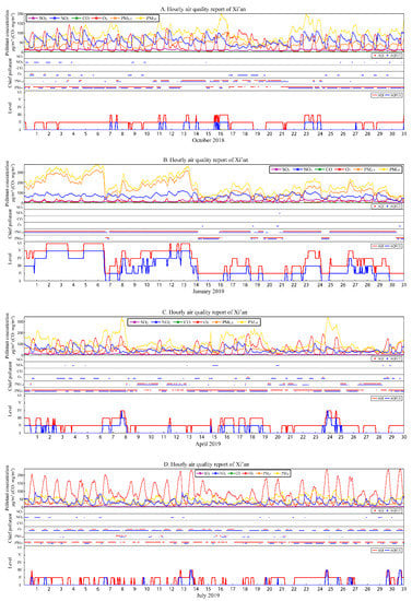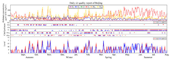 It is clear from Figure 7 that ozone pollution is also a tough problem in the summer of Xi’an. Perennial pollution transport from the northeast and local pollution emission as well as sand dust transport from the northwest cause severe particle pollution in autumn, winter (mainly PM2.5) and spring (mainly PM10). From Figure 7, comparison results of daily and hourly reports are similar to Beijing and Shanghai. The AQFCE and AQI have an approximate performance in chief pollutant (83.84%) and level (49.9%/0.78) for daily reports (Figure 7), while huge divergences on the chief pollutant in summer (Figure 8D) and level in winter (Figure 8B) stem from magnified particle pollution by the AQI for hourly reports. Table 5 presents the comparison of evaluation results between the AQI and AQFCE by consistency and similarity.