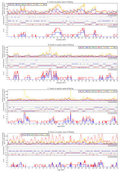 For hourly reports (Figure 4A–D), the incomplete criterion of the AQI is really a problem for not only the comparison but also AQI’s own evaluation. This is because in the hourly report of the AQI PM2.5 and PM10 use daily criterion while other pollutants use hourly criterion, which is unreasonable. This leads to an exaggerated hazard of PM2.5 and PM10, and they are more likely to be chosen as chief pollutants even if they are not the biggest hazard. The AQI’s level is decided by the chief pollutant alone, so a questionable chief pollutant may give a meaningless air quality level. Experimental results prove this and there are antinomies in the results of the AQI. For example, on 23 October 2018, the chief pollutant of the hourly report was PM10 in every hour but the daily report’s chief pollutant was NO2, which is contradictory. The AQFCE is complete in hourly reports, and there is a marked drop of CR compared with the daily report as expected—63.04% and 45.49% for the chief pollutant and level. PM2.5 and PM10 without hourly criterion really disturb the comparison, but CR increase significantly to 89.74% and 97.39%, respectively, after eliminating their influence, which means AQI with appropriate concentration limits is similar to the AQFCE. Actually, an hourly report of the AQI is severely affected by its criterion, and the AQFCE is robust for use in various tasks.