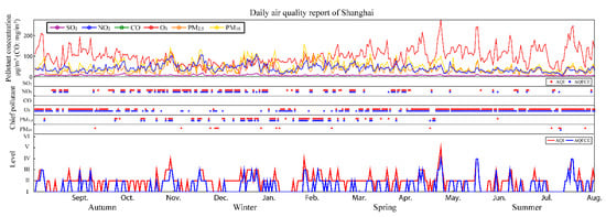 Daily pollutant concentration variation and air quality evaluation result of chief pollutant and level of Shanghai.