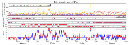 Daily pollutant concentration variation and air quality evaluation result of chief pollutant and level of Xi’an.