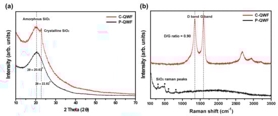 In order to investigate the crystal structure of the QWF series, XRD was executed from 10 to 70° as shown in Figure 1a. The XRD peak of both QWF electrodes can be broadly indexed as amorphous silica, detected at 2θ = 20.63°, and as crystalline silica, which is detected at 2θ = 22.82°. The Raman spectra of the QWF electrodes confirm several shifts in the low wavenumber range from 100 to 700 cm−1, related to amorphous silica. It was confirmed that the crystalline SiO2 peak was observed in C-QWF in XRD after heat treatment but disappeared in Raman spectra, as seen in Figure 1b. The change of Raman peak according to the heat treatment of SiO2 is due to the difference in crystallinity according to the temperature of the silica, and it is also proof that the initial amorphous silica was crystallized by the heat treatment as CNTs grew. In terms of CNTs, the D band, located at 1350 cm−1, is related to the size of the in-plane sp2 domains, while the G band, located at 1600 cm−1, arises from the first-order scattering of the E2g phonon of the sp2 C. The D/G band of the C-QWF electrode appeared after the growth of CNTs, indicating the formation of both the new graphitic domain and defect-induced disordered sp2 carbon atoms. The increase of the D/G band ratio in the C-QWF electrode provides direct evidence for the growth of CNTs on the surface of silica fabric.