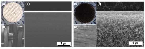 Table 2 shows the compositional ratio of deposited metal catalysts contributing the growth of carbon layer and CNTs in C-QWF electrode. This was confirmed by ICP-MS and EA, respectively. The elemental ratio of metal catalysts confirm that the primary deposition effectively occurred on the silica surface through the sputtering process. The increase in weight ratio from P-QWF of 0.161% to C-QWF of 0.238% also shows that the metal catalysts effectively assist the growth of CNTs. The optical image and the morphology of the P-QWF electrode are shown in Figure 2a,b. Figure 2c shows the surface of silica fiber exists without other impurities before the CVD process. After the growth of CNTs on P-QWF, the color of the QWF electrode is changed from white to black due to the existence of CNTs, and its surface also looks rougher than before, as shown in Figure 2d,e. As-synthesized CNTs are observed entangled with each other on the surface in Figure 2f.