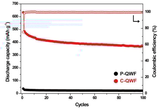 The electrochemical performances of the QWF electrodes are presented in Figure 4. The reversible capacity of P-QWF electrode is under 50 mAh g−1 because of the sluggish electrical conductivity of silica fiber. In the case of the C-QWF electrode, it had a discharge capacity of 640 mAh g−1 in the first cycle, and dropped to 485 mAh g−1 in the next cycle because of the formation of the solid electrolyte interphase (SEI) layer. It obtained the reversible capacity of 380 mAh g−1, which is close to the theoretical capacity of graphite (372 mAh g−1). This remarkable energy density is expected to be caused by a large surface area of entangled CNTs, facilitating the reaction site to store lithium ion and providing the electron path between the nonconductive substrate and external circuit without any current collector.
