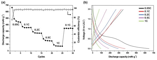 The rate performances of the C-QWF electrode are 660, 380, 298, 192, and 99 mAh g−1 at different current densities from 0.05 to 0.1, 0.2, 0.5, and 1.0 C-rate, respectively, as shown in Figure 5a. When the current was decreased to 0.1 C-rate, it still exhibited a reversible capacity of 369 mAh g−1. This means that the C-QWF anode can tolerate high-rate cycling even at 1 C-rate, although the main composition of the electrodes is amorphous silicon oxide, which cannot provide electron paths. The voltage profiles in Figure 5b demonstrate the excellent electrochemical reversibility with a coulombic efficiency of 99.5%, except the first cycle. The plateau located at 0.7 V in the first lithiation process is generally known to originate from the formation of the SEI layer, relating to the decomposition of the organic electrolyte and irreversible reactions.