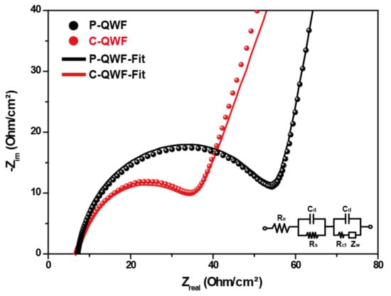 Nyquist plots of P-QWF (60.3 Ω cm−2) and C-QWF electrodes (42.8 Ω cm−2).