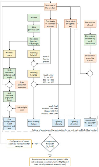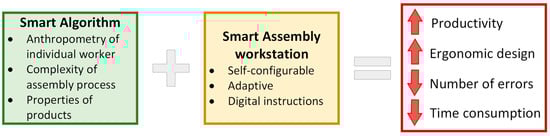26], but visualization itself through AR does not ensure higher productivity and ergonomic suitability of the workplace. To achieve these results and reduce the number of errors in assembly operations and shorten the time of work operations due to human error, it is necessary to design a self-configurable smart manual assembly workstation with smart technologies for error prevention, visualization and an implemented smart algorithm that connects the technologies and adapts the workplace depending on the selected influencing parameters. The smart algorithm includes three main groups of influential parameters: human, assembly process and product, as shown in