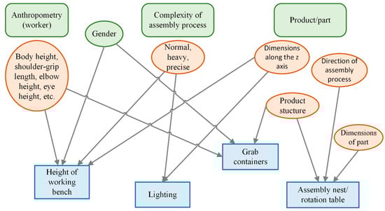Figure 3 shows the dependencies between the influential parameters of the smart algorithm and their influence on the control of the smart manual assembly workstation. Using a smart algorithm, we control the height of the workbench, lighting and grab containers with parts and rotation of the assembly nest. The anthropometric characteristics takes directly into account the body height (with standard deviation), and indirectly the hand range, elbow height, eye height, shoulder-grip length, and additionally the gender of the worker [