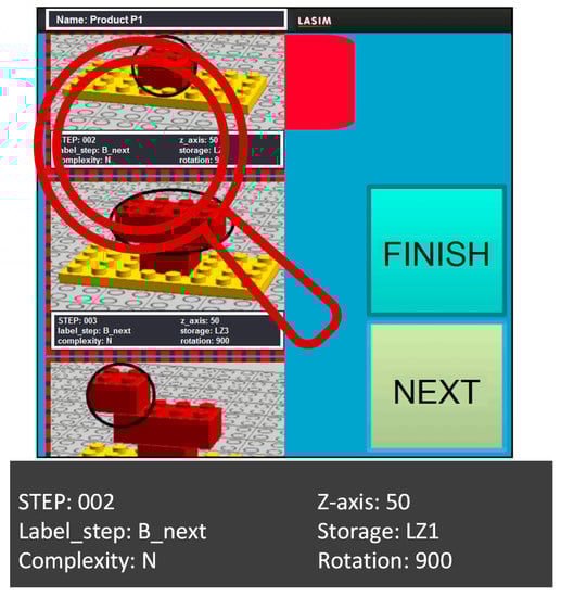 The structure of the product is displayed to the worker in the form of digital instructions and is shown directly on the screen of the smart manual assembly workstation. The worker communicates and confirms the performed operations by clicking the button (B_next) until the assembly process of the product is completed, which is determined by the end button (B_finish).