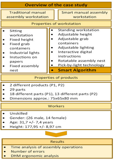 Figure 6 shows the methodology of the case study, which is divided into a description and functioning of a traditional and smart manual assembly workstation, as well as a description of experimental work involving workers, the product and a DHM simulation to determine ergonomic suitability. The study provides results on the time required to perform the assembly process, the number of errors at a smart and traditional workplace during the assembling the product and the assessment of the ergonomic design.