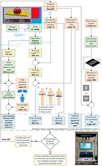 Figure 4 shows the block diagram of the algorithm. The worker logs on with the RFID chip to the smart assembly workstation where the RFID reader is mounted. The chip contains the worker’s ID number, which is connected to the SQLite database, from where the worker’s anthropometric data is stored. These data are used to determine the “working height 1” and the distance and inclination of the grab containers based on empirical equations and recommendations [