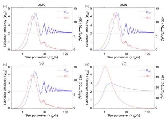 The calculated extinction efficiency (Qext, blue) and mass extinction efficiency (MEE, red) as a function of size parameter () for (a) ammonium sulfate (AMS), (b) ammonium nitrate (AMN), (c) sea salt (SS, NaCl), and (d) elemental carbon (EC). Mie code [3] was used for these calculations at a wavelength λ = 550 nm, and the corresponding refractive indices and density of aerosols are shown in Table 1.