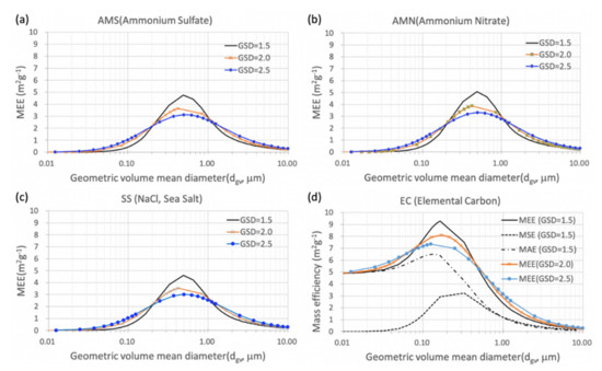 The calculated mass extinction efficiency (MEE) of (a) ammonium sulfate (AMS), (b) ammonium nitrate (AMN), (c) sea salt (SS, NaCl), and (d) elemental carbon (EC) as a function of geometric volume–mean diameter with varying geometric standard deviations (GSD) of 1.5, 2.0, and 2.5. For EC with GSD = 1.5, mass scattering efficiency (MSE) and mass absorption efficiency (MAE) are also embedded.