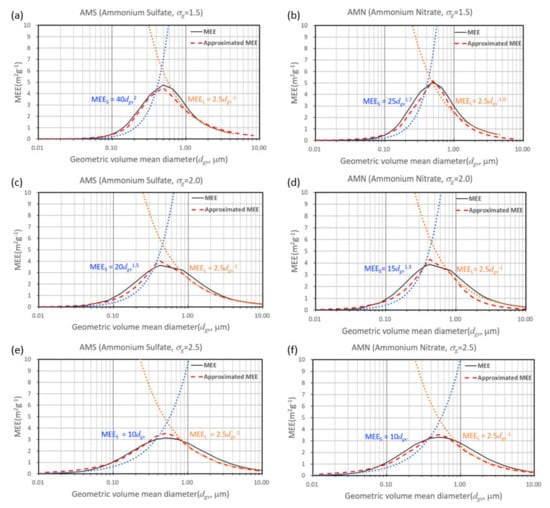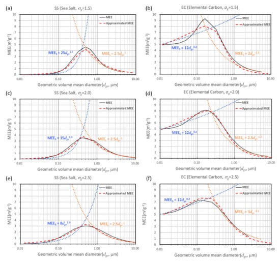 In contrast, for EC, the MEES was approximated as regardless of geometric standard deviation, while the MEEL had different representations for different geometric standard deviations. The approximated MEEL for EC was , , and for geometric standard deviations of 1.5, 2.0, and 2.5, respectively. The same procedure to determine MEES and MEEL (Equation (6)) and MEE for intermediate size range by harmonic mean-type approximation (Equation (5)) for AMS and AMN in Figure 4 was also applied to sea salt and EC.