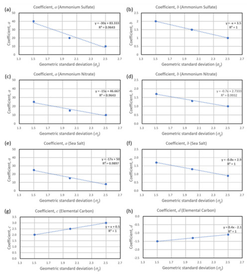 The determined mass extinction efficiency coefficients a and b as a function of geometric standard deviation in Equation (6) for ammonium sulfate (a,b), ammonium nitrate (c,d), and sea salt (e,f). For elemental carbon coefficients, c (g) and d (h) are determined.