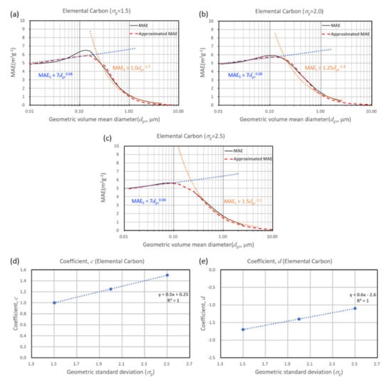 Comparison between the Mie theory-based calculation of mass absorption efficiency (MAE, solid black lines) and the approximated MAE (long-dashed red lines) of elemental carbon for geometric standard deviations () of (a) 1.5, (b) 2.0, and (c) 2.5. The approximated mass extinction efficiency in each panel is calculated based on the MAES (dotted blue line) and the MAEL (dotted orange line) in each panel using Equation (5). The determined coefficients c and d of MAE as a function of geometric standard deviation in Equation (6) for elemental carbon are shown in panel (d,e).