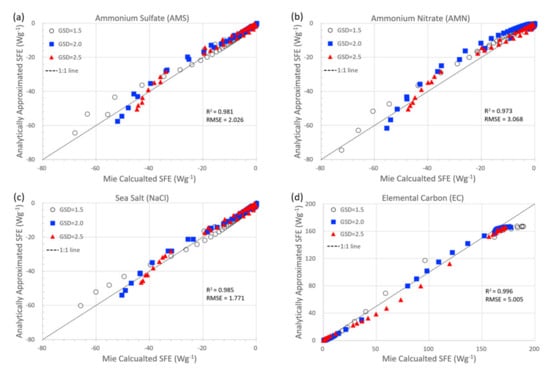 Comparison between the simple forcing efficiency (SFE) calculated using analytical approximation and those using Mie theory-based calculation for (a) ammonium sulfate (AMS), (b) ammonium nitrate (AMN), (c) sea salt (NaCl), and (d) elemental carbon (EC) with geometric standard deviations (GSD) of 1.5, 2.0, and 2.5. The correlation coefficient (r2) and root mean square error (RMSE) are embedded in each panel. The black dotted line in each panel is a 1:1 line.