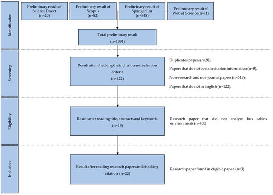 Besides the Boolean operator AND, employed to combine the keywords from the two columns in Table 1, this investigation utilized OR between the words from the third column. Thus, the final combination was denoted by the following expression: “bus” AND (“PPD” OR “PMV” OR “Predicted Percentage Dissatisfied” OR “Predicted Mean Vote” OR “thermal comfort” OR “thermal discomfort”). Afterward, a search was conducted in the databases Science Direct, Scopus, Springer Link, and Web of Science up to 17 October 2020, with no time restrictions.