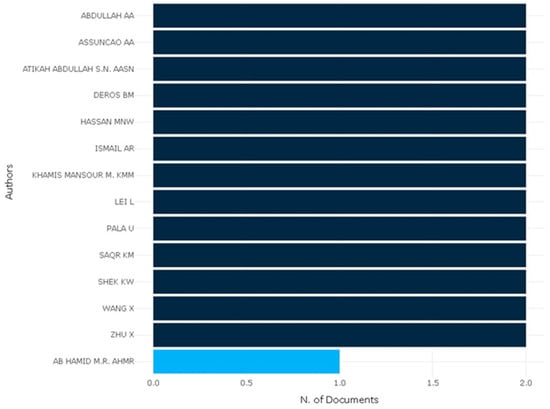 Figure 3 shows that the authors Abdullah, A.A.; Assunção, A.A.; Atikah Abdullah, S.N.; Deros, B.N.; Ismail, A.R.; Khamis, M.; Lei, L.; Pala, U.; Saqr, K.M.; Shek, K.W.; Wang, X.; Zhu, X., with two works each, published the highest number of research papers in journals. However, as leading authors, Ismail, A.R.; Krames, M.; Pala, U.; Zhu, X. appear with two publications each, while Assunção, A.A. and Shek, K.M. published one paper as leading authors and another as co-authors. The other scholars listed are co-authors that participated in two publications.