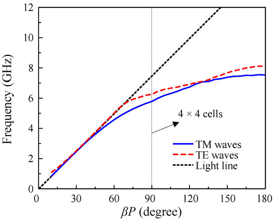 where βsw is the propagation constant and N and P are the unit cell number and its periodicity, respectively. Figure 2 presents the dispersion diagram, which shows the phase shift of the single unit cell at a given frequency at the first two eigenmodes, TM (transverse magnetic) and TE (transverse electric). Here, when the phase shift is 90°, the surface wave resonant frequencies of the MS, which are defined by the intersection between the vertical lines (βSWP = 90°) and the dispersion curves, are around 5.7 and 6.2 GHz. According to Equation (2), the number of unit cells is 2 × 2 with m = 1 and 4 × 4 with m = 2. Since the MS is the radiating aperture of the antenna, a larger MS will have a larger aperture, leading to higher gain radiation. Thus, we choose m = 2 to obtain high gain radiation for the proposed design. It is noted that the number of unit cells can be increased; however, the drawback is large antenna dimensions.