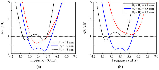 The simulated performance of the antenna without an MS and with a uniform MS (Wi = Wo) is compared and depicted in Figure 3. As observed, significant improvements in both −10 dB |S11| and 3 dB AR BWs can be obtained with the presence of MS. In the |S11| profile, besides the lower resonances at 4.7 and 5.1 GHz produced by the driven patch, there are also two additional resonances at 5.8 and 6.3 GHz. These resonances are generated by the MS and are quite well matched with the prediction based on the dispersion diagram in Figure 2. This phenomenon has been thoroughly investigated in [26]. In terms of AR, there are two CP bands at around 5.1 and 5.7 GHz, which are respectively produced by the driven patch and the MS. For better demonstration, Figure 4 presents the simulated AR of the antenna for different sizes of the patch (Wp) and the unit cell (Wi). It can be observed that tuning Wp has a strong impact on the lower CP resonance, which shifts to a higher band as Wp decreases. Meanwhile, the higher CP resonance is almost stable with the variation of Wp. The data confirm that the patch is critical for the lower band operation. A similar behavior with higher CP resonance when tuning Wi can be observed in Figure 4b. However, as the MS is an effective radiating aperture of the proposed antenna, the variation of Wi also has a significant effect on the lower frequency, which shifts downwards as Wi increases.