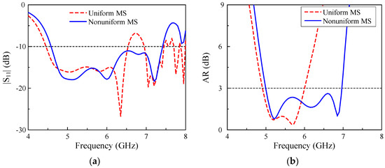 Simulated (a) |S11| and (b) AR for the antenna using a uniform MS and non-uniform MS.