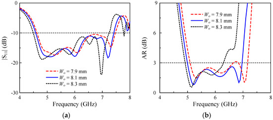 Next, the MS is modified with different sizes of unit cells (Wi ≠ Wo) to achieve better performance. The simulated performances of the antenna with a uniform MS and non-uniform MS are illustrated in Figure 5. It can be seen that, by using a non-uniform MS, an additional CP band around 6.8 GHz is produced, which contributes to significantly increasing the antenna’s overall 3 dB AR BW to 33.3% (5.0–7.0 GHz). The additional CP resonance can be adjusted by tuning the size of the outer MS unit cell, Wo. Figure 6 shows the antenna’s AR characteristics for different values of Wo. Obviously, tuning Wo has a significant influence on the CP band at around 6.8 GHz, which increases as Wo is decreased.