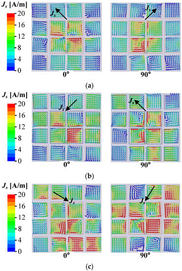 Since the MS is a radiating aperture of the proposed antenna, the surface currents (Js) on the MS are considered to demonstrate the CP radiation of the proposed antenna. Figure 7 shows the simulated Js at the three different minimum AR points of 5.2, 6.2 and 6.8 GHz. It can be seen that, in these cases, when the phase changes from 0° to 90°, the vector Js is rotated in a clockwise direction. Thus, the antenna will generate left-hand CP (LHCP) radiation in the broadside direction. At 5.2 GHz, this resonance is created by the driven patch, and thus the Js is highly concentrated at the four center unit cells of the MS. At 6.2 and 6.8 GHz, more currents are occupied in the outer unit cells because these resonances are generated by the surface waves propagating on the MS. However, it can be seen obviously that at 6.9 GHz, the Js on the outer unit cells is very strong. This explains why an additional band can be obtained by modifying the uniform MS to a non-uniform MS.
