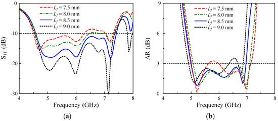 Finally, the impedance matching of the proposed design is considered. The parameter studies indicate that the feeding position is a critical parameter to determine the antenna’s matching performance. Figure 8 shows the simulated reflection coefficients and ARs against the variation of feeding position, Lf. Here, increasing Lf results in a significant improvement in the matching performance. Regarding the AR response, tuning the feeding position changes the length of the feeding line. This variation will lead to different coupling scenarios between the driven patch and the MS. Thus, the AR characteristic, particularly in the high-frequency band, is affected.