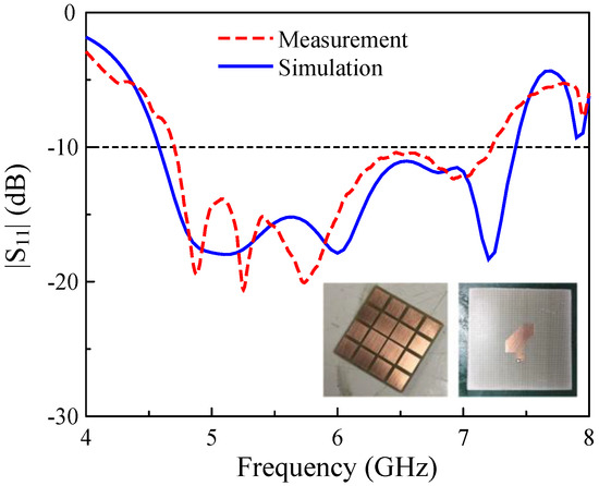The proposed antenna was fabricated and experimentally checked. The PNA Network Analyzer N5224A (Keysight, Santa Rosa, CA, USA) was used to measure the antenna’s reflection coefficient, and the far-field characteristics were implemented by the Microwave Technologies Group [27]. Generally, the measured data matched well with the simulated data. There were still several discrepancies, which were caused by the tolerance in fabrication and the imperfection of the measurement setup.