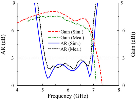 The simulated and measured |S11| results of the proposed MS-based antenna are illustrated in Figure 9. The antenna showed good matching performance in a wide frequency range from 4.7 to 7.2 GHz, equivalent to 42.1%. Figure 10 depicts the far-field radiation characteristics in terms of AR and gain in the boresight direction. As observed, the measured 3 dB AR BW was 30% (5.1–6.9 GHz); furthermore, the measured gain was from 5.6 to 7.6 dBic.