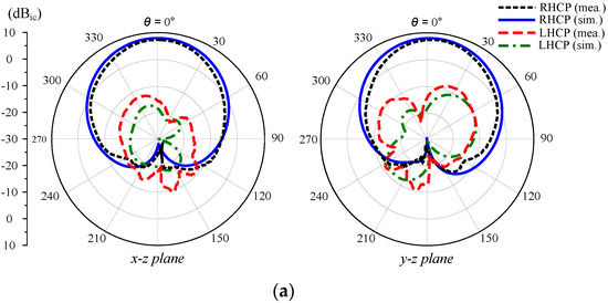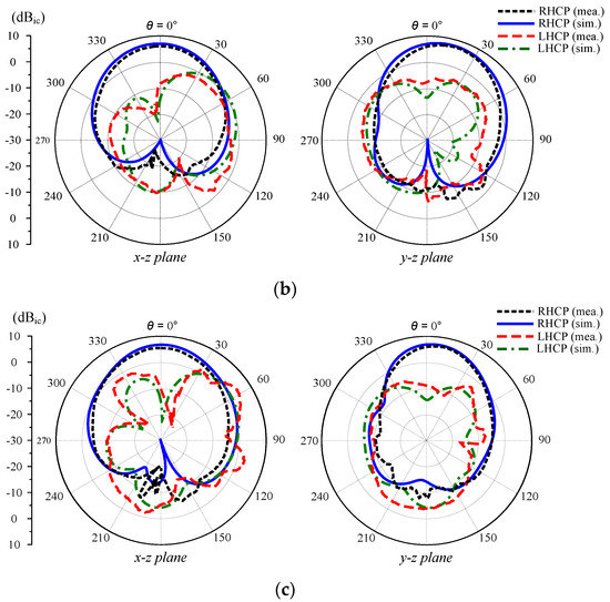 Figure 11 plots the antenna gain radiation patterns in the x–z and y–z planes at three different frequencies of 5.2, 6.2 and 6.8 GHz. It can be seen that LHCP radiation is the dominant operating mode of the proposed antenna. In the broadside direction (θ = 0°), the polarization isolation defined by the difference between the right-hand CP (RHCP) level and LHCP level is higher than 16 dB. Besides, the front-to-back ratio is always greater than 12 dB across the operating band.