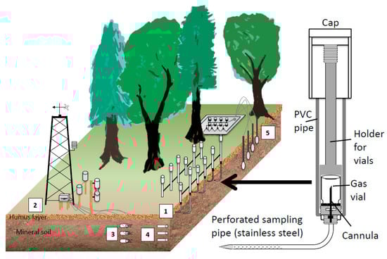 To monitor soil gas concentration, we used arrays of passive gas samplers which are similar to the sampler of Schack-Kirchner et al. []. The gas samplers consist of a pipe made of polyvinyl chloride (PVC) which is closed at the lower end, a perforated stainless-steel pipe that leaves the bottom of the PVC pipe in an angle of 90° and a fine cannula at the bottom inside the PVC pipe (Figure 1, right). Gas vials can be introduced into the PVC pipe from the top and mounted onto the cannula which pierces the septum. The air inside the vial and the soil air around the perforated stainless-steel pipe equilibrate with time. A PVC cap is used to close the top of the sampler.