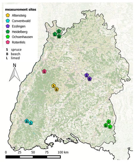 FVA-BW manages and maintains 13 monitoring plots at 6 different sites (Figure 3, Table 2 and Table 3) Rotenfels (RO) Altensteig (AL), Conventwald (CO), Heidelberg (HD), Ochsenhausen (OC)) in the forests of Baden-Württemberg, Germany. Of these 13 plots, ten plots at 5 sites are also listed as ICP Level 2 Monitoring plots according the ICP Forest Intensive Monitoring Program [].