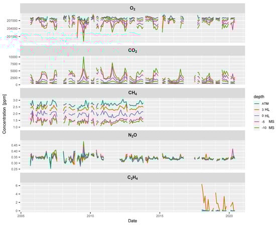 Time series of the soil gas profile at the ES spruce plot showing the course of average concentrations of O2, CO2, CH4, N2O and C2H4 at different positions in the mineral soil (−10, −5, MS), in the humus layer (0, 3, HL), and in the atmosphere (ATM). CO2, O2 and N2O concentration measurements cover almost the entire observation period, while technical difficulties limit the data availability of CH4 and C2H4 concentrations.