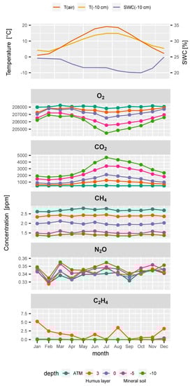Typical seasonal time course of (from top to bottom) air temperature (T(air)), soil temperature (T(−10 cm)) and soil water content (SWC(−10 cm)) at 10 cm depth, and averaged monthly soil gas concentrations of O2, CO2, CH4, N2O, and C2H4 of all samplers at a depth in the soil profile and in the atmosphere (ATM).
