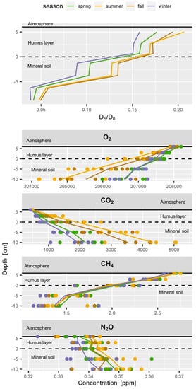 Soil water content, soil temperature and soil gas diffusivity are important drivers and underlay seasonal cycles (Figure 5 and Figure 6). DS/D0 is highest in the humus layer and lower in the deeper mineral soil layers (Figure 6 top). This is an effect of the decrease in total pore space with depth which results from the load of the soil above [,]. DS/D0 is decreasing with depth within each layer because soil water content is usually increasing with depth. The typical DS/D0 profile changes through the seasons. The wet seasons of spring and winter have higher soil water contents and thus lower DS/D0 values than the warmer and drier seasons of summer and fall (Figure 5 and Figure 6).