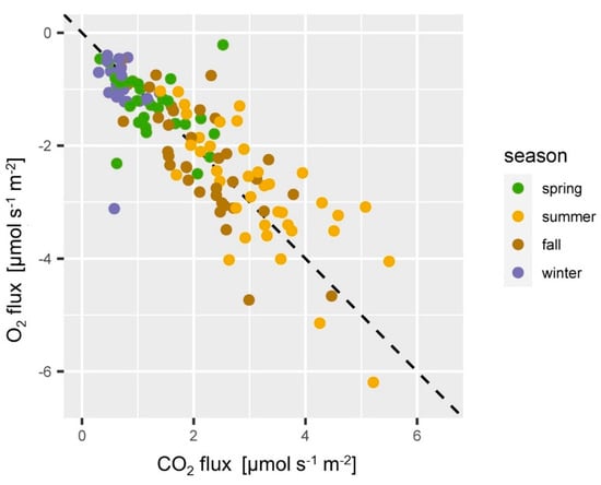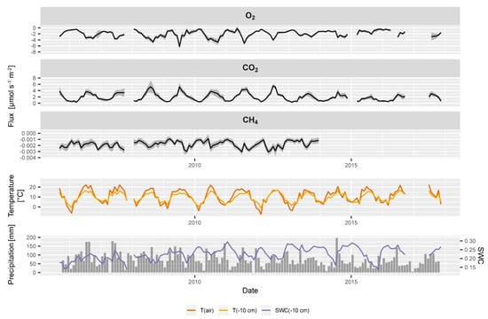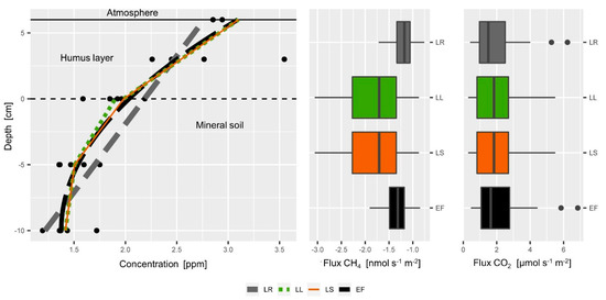 For the detailed interpretation of typical patterns of soil gas fluxes we present LL derived flux estimates, unless it is stated otherwise. The LR approach was used to calculate O2 fluxes since the lower relative measurement precision of O2 concentrations required an approach that was less sensitive to possible outliers. It is generally assumed that the organic layer hardly contributes to CH4 consumption []. Thus, negative soil CH4 fluxes (CH4 consumption) were not extrapolated to the soil surface but calculated directly from the observed CH4 gradient in the humus layer. We considered the uncertainty of the estimation of the diffusivity and of the concentration gradient to quantify the uncertainty included in the soil-atmosphere fluxes. Uncertainty of the diffusivity estimation results from the uncertainty soil water content measurement which was set to +/−2 Vol.-%, and the diffusivity model, which was not considered here. Uncertainty of the gradient estimation was calculated from the regression function for CH4 and O2, and based on the propagation of errors of the flux estimates for the extrapolated soil-atmosphere flux for CO2. The statistical programming language R, Version 4.0.2 (2020-06-22) [] was used for data processing unless stated otherwise, including the packages ggplot2 [] and dplyr [].
