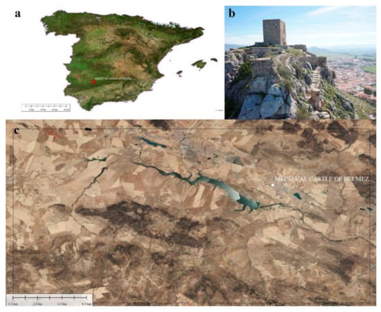 (a) Location of the medieval Castle of Belmez. (b) Panoramic view from the Cerro del Castillo of Belmez. (c) Area surrounding the castle shown using Virtual Reality imaging. Copyright “Ager Mellariensis”/AEI FEDER HAR 77136-R.