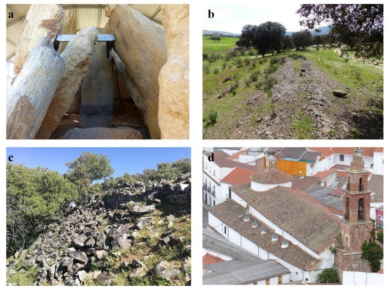 Monuments located in the area surrounding the Cerro del Castillo of Belmez (CCB). Copyright “Ager Mellariensis”/AEI FEDER HAR 77136-R. (a) Casas de Don Pedro megalithic monument (5500–2500 BC). (b) Roman road in Espiel (1 BC). (c) Andalusí fortress in El Hoyo (10 AD). (d) Medieval church of Belmez (13 AD).