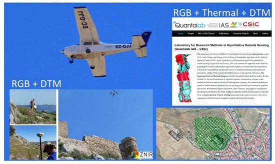 The first airborne survey (30 June 2014 at 12 p.m. UTC + 01:00) covered an area measuring 1040 hectares. The survey was carried out using two sensors mounted simultaneously on board in a Cessna aircraft flying at 250 m above ground level. The first sensor was a FLIR SC655 thermal camera (FLIR Systems, Inc., Wilsonville, OR, USA) with a resolution of 640 × 480 pixels, which was equipped with a 13.1 mm F1.3 lens connected to a computer via USB2.0 protocol. The spectral response was in the range 8–12 µm. The camera was calibrated in the laboratory (Quantalab; IAS-CSIC, Cordoba, Spain) to obtain radiance values. A total of 5133 images were acquired during this survey. Orthorectification and imagery mosaicking were conducted using the structure from motion method (SfM) to obtain two thermal mosaics in Kelvin degrees with a spatial resolution of 0.37 m/px. The second sensor for this first campaign was an RGB sensor (NIKON D800E). A total of 3473 images were acquired. Orthorectification and imagery mosaicking were conducted as described above for thermal mosaic images, allowing us to obtain a very high-resolution orthophoto and a digital surface model (DSM) with a spatial resolution of 0.036 m/px.