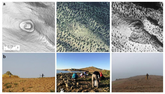 Regarding the workflow, the first step was to assess the shapes of the newly identified sites. In prehistoric, Roman, and medieval archeology, the shapes of different settlements are well known, which allowed us to assess the veracity of the forms detected in the landscape. The second step entailed photogrammetric documentation or geophysical prospection to assess the formal characteristics of the sites in greater detail. The third step was to determine the chronology of the sites by means of ground recognition, which involved collecting archeological pieces of pottery or other materials. Finally, the fourth step was archeological excavation (Figure 4).